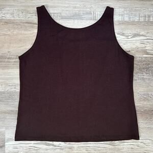 Minimalist scoop neck tank top by Eileen Fisher in rich espresso brown. Crafted from 90% organic cotton with 10% lycra for stretch. Made in the USA. Size Large. A versatile, sustainably made wardrobe essential.