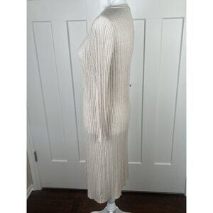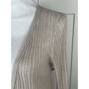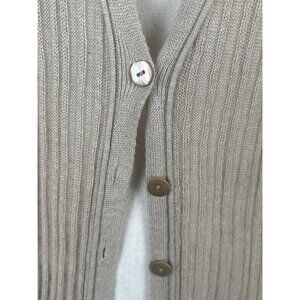 Eileen Fisher longline organic linen soft taupe/beige ribbed cardigan. Full button front, dark mother of pearl buttons, v-neckline. 3/4 length sleeves. Lightweight and breathable.