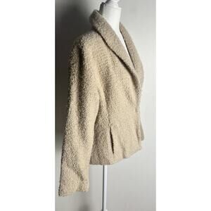 Elevate your wardrobe with this designer Eileen Fisher jacket. The fuzzy blazer is made from a wool-nylon blend and features a hook closure. The jacket has a regular fit and is a size small. The solid beige color and knit fabric type make it perfect for the winter and fall seasons. The collared design and long sleeves add a touch of sophistication, making it suitable for both business and travel occasions. The lightweight jacket also includes pockets for convenience. Dry clean only.