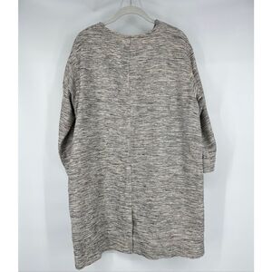 This Eileen Fisher textured knit coat cardigan in size L/G offers an effortlessly elevated minimalist style with a refined open-weave fabric and a soft, structured drape. The piece features a button-front closure, 3/4 sleeves, side pockets, and a modern collarless neckline. Crafted from a high-quality blend of 86% cotton and 14% polyester, it delivers comfort, breathability, and a lightweight feel perfect for layering.