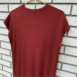 An effortless dress with a round neck and cap sleeves. In a ribbed stretch knit made with Tencel Lyocell. Close at the shoulders, wider at the hem. A silhouette that fits the body with ease. Round neck, cap sleeves, side panel detail. A textured rib that's stretchy with just the right amount of body. Made in USA of imported materials. 89% Tencel Lyocell/11% Spandex. Size XS. Excellent used condition.