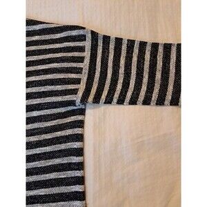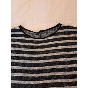 Looking for a stylish and comfortable top to add to your wardrobe? Check out this Eileen Fisher top in gray and white, with buttons in the back. It's a great addition to any outfit, and it's available in size L. This top is in excellent shape, perfect for any occasion.