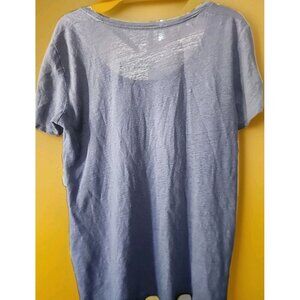 The Eileen Fisher Top in size small is a stylish and versatile blue linen jersey tee that is perfect for various occasions. This relaxed fit T-shirt features a round neckline, short casual sleeves, and a pullover closure. Made from lightweight and breathable linen material, this top is easy to care for and ideal for year-round wear. Whether you're dressing for travel, parties, casual outings, or workwear, this top offers comfort and style with its bohemian and classic themes. Suitable for regular size women, this designer top is a must-have addition to any wardrobe.