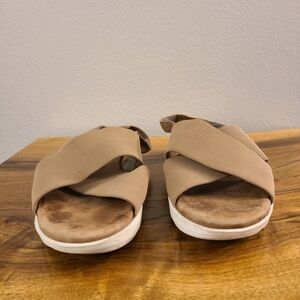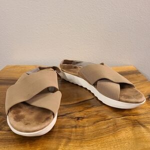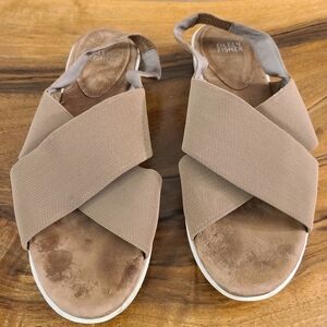 Eileen Fisher Trek Mesh Slingback Taupe Cross Over Sandals. These shoes are in good preowned condition. There is some wear to the wedge, soles and toe wear.