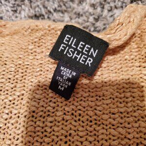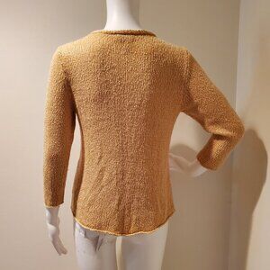 Eileen Fisher v-neck sweater. This is a linen blend and a yellow gold color. It is a size M. Armpit to armpit measures 16 inches and shoulder to hem is 22 inches.