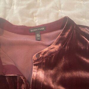 This is a gorgeous velvet Eileen Fisher Velvet button front dress in the color Cassis. It is in excellent condition and is perfect for your upcoming holidays. Knee length and with a mandarin collar.