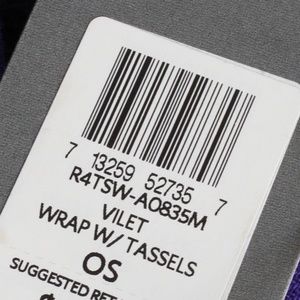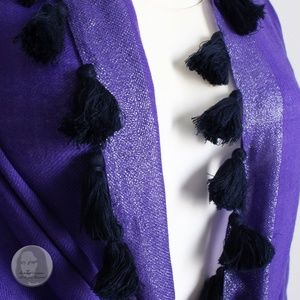 Authentic, new with tags (NWT), new old stock (NOS) Eileen Fisher Violet Wrap with Tassels, from around 2014. Made from "Tasseled Shimmer Wool", a light wool knit with shimmer at the edges, it's trimmed in soft tassels!