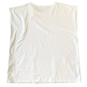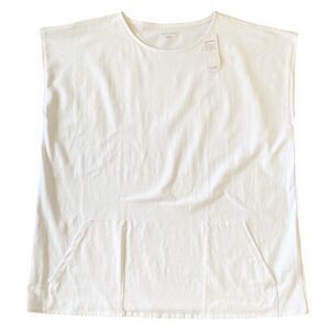 Eileen Fisher white Pima cotton stretch jersey boxy jewel neck top with pockets.