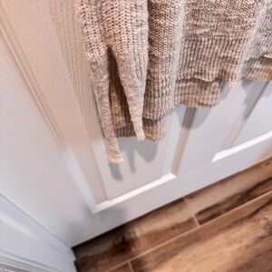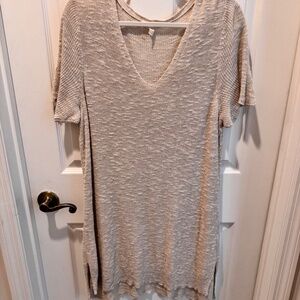 Eileen Fisher woman's dress in beige knit. Size XL. V neck, shorter in front, longer in back, short sleeve. Organic linen, cotton blend. Hand wash, air dry. Condition is fair to good. No snags in material. Measures 35" length in front, 37 1/2" length in back. 20" underarm to underarm. Light weight, airy. Summer wear. So comfortable!