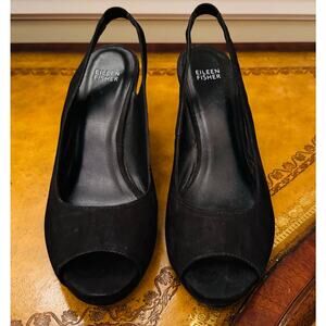 Eileen Fisher Women Black Suede Leather Wedge Peep Toe Slingback Crescent Shoes Size 9
