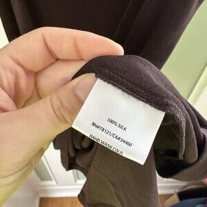 Gorgeous deep brown-ish maroon/burgundy/wine color perfect for fall in lovely silk. One small nub at side seam on front as shown, otherwise no flaws and lightly worn. Size PETITE SMALL.