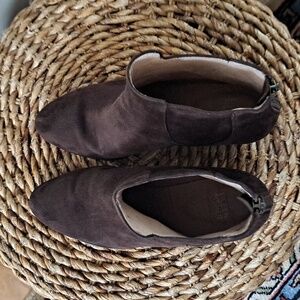 Comfortable, luxury chocolate brown suede ankle boots with 3" block heel and back heel zipper. Pre-owned and in very gently used condition. Minor wear. Please see pictures.