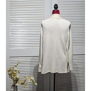 This luxurious cardigan by Eileen Fisher is a blend of silk, rayon, and nylon, offering a soft, breathable feel. Designed for women, the open-front style and neutral cream color make it versatile for layering over outfits. Its lightweight composition is perfect for adding elegance without extra bulk.