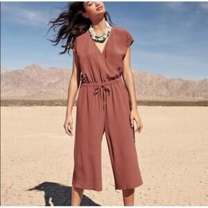 Pretty and polished, the drawstring-waist jumpsuit, is lightened up in a breezy cropped cut of woven fabric with fluid drape. Surplice V neckline Short cap sleeves Drawstring at waist Relaxed silhouette Hidden back-zip closure Wide legs fall from hips Cropped above ankles Front pockets Machine wash 60% Tencel/lyocell, 40% viscose Oversized by design
