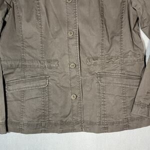 Eileen Fisher Womens Ruffle Collar Jacket Medium Tan Stretch Button Down Blazer