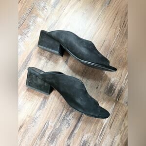 Eileen fisher black Katniss mules. Suede nubuck body. Approx 2 inch heel. Some marks on the body. Just needs a good suede cleaning. Women’s size 8.