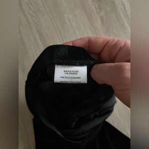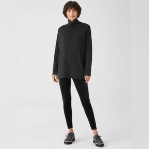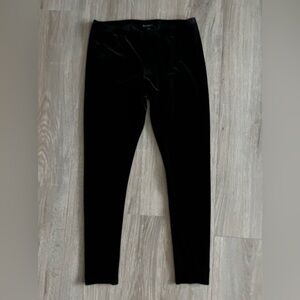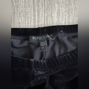 These Eileen Fisher velvet leggings are black and have an elastic waist. They have a slim fit and hit at the ankle. In very good condition with minor wash wear!