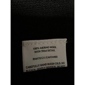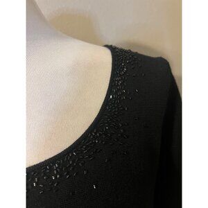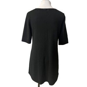 This pretty sweater is from Eileen Fisher in a misses size medium. Made of 100% Merino wool (the thin, smooth type). Jet black in color with tiny black beads around the neckline. Hand washable Pullover, longer length in a tunic style.