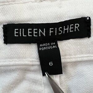 This product is a pair of Eileen Fisher women's white jeans in size 6, made from organic cotton and spandex for a comfortable fit. The slim ankle length and skinny fit give a sleek look. Machine washable and with a 5-pocket design, these jeans are both stylish and practical for everyday wear.
