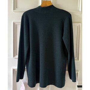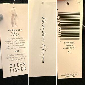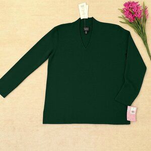 Add timeless ease to your wardrobe with this Eileen Fisher washable wool crepe sweater in a rich Rainforest green. Made from 100% wool spun from Italian yarn, this long sleeve pullover features a clean V-neckline, straight hem with side slits, and a lightweight crepe texture that drapes beautifully. Designed in a relaxed silhouette, it’s machine washable and perfect for layering in cool weather. A great fit for Quiet Luxury, Minimalist, and Elegant Academia aesthetics. New with tags, size PL (Petite Large). Made in Hong Kong.
