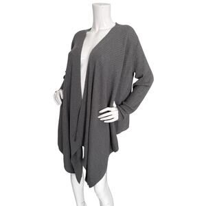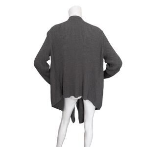 Gray wool rib knit, draped open front, hangs longer in front, long sleeves.