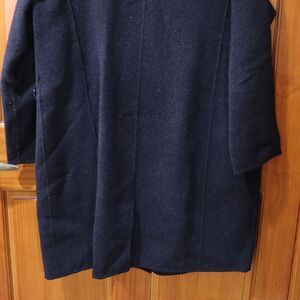 Elegant black pea coat by Eileen Fisher. Features a sleek design with a high collar. Perfect for a sophisticated look.