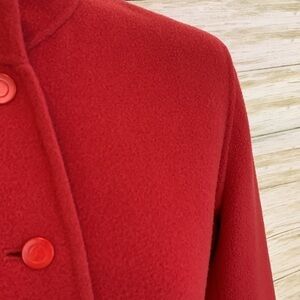 Eileen Fisher jacket. 72% wool/20% nylon/8% cashmere. Pretty muted red color (photo is more red/orange but jacket is actually more watermelon red). Button front. Two front pockets. Unlined. Women’s size Petite Medium. Good used condition.
