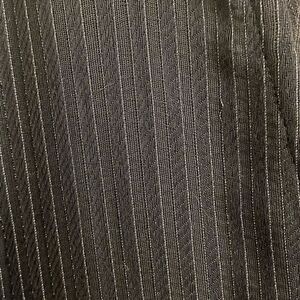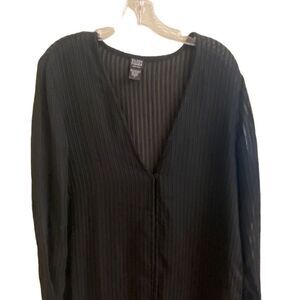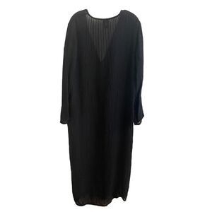 Black long sleeve semi sheer wool blend duster cardigan. Stripes. Single button closure. V-neck.