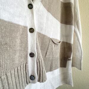 Chic and breathable, this 100% linen Eileen Fisher cardigan in size XS features soft beige and white stripes, a relaxed open fit with button front, and cozy patch pockets. Lightweight and perfect for transitional weather, it's ideal for styling with denim, trousers, or linen pants for an effortless look.
