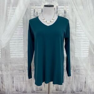 Eileen Fisher Size XXS 2XS Green V-neck Jersey Boxy Top Deep Agean Shirt