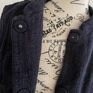 This Eileen Fisher jacket is an exquisite addition to your wardrobe. The stunning navy tweed design with a cotton linen blend enhances its pop beauty, making it perfect for any occasion, whether it's a business meeting or a casual day out.