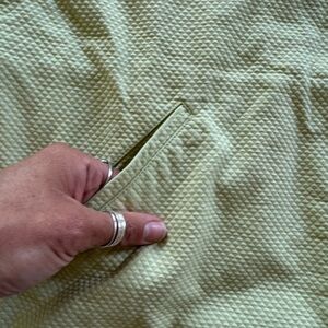 The Eileen Fisher Quilted Jacket in green, size M, is a stylish and versatile outerwear piece perfect for travel and casual occasions. Made from viscose outer shell material with a cotton lining, this jacket features a solid pattern and quilted accents. The full zip closure adds a modern touch, while the zipped pockets provide practicality. The lightweight design and collarless style make it ideal for the Fall and Spring seasons, giving off a Bohemian vibe. Perfect for any woman looking for a chic and comfortable jacket that combines fashion and function.