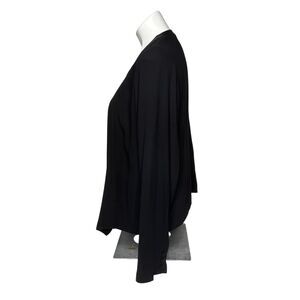 Eileen Fisher black 100% silk drape front jacket with leather trim size PL. Front pockets. Good condition but has one very small snag (see photos). Shell 100% silk. Body Lining 100% silk. Trim 100% leather. Dry clean only. Length 23” Chest 21”.