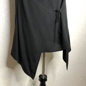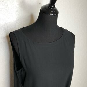 Eileen Fisher black silk sleeveless tie waist top. Pullover style with round neckline. Sleeveless. Panels that tie at waist front or back. Size Small. Excellent preowned condition. A couple of tiny snags.