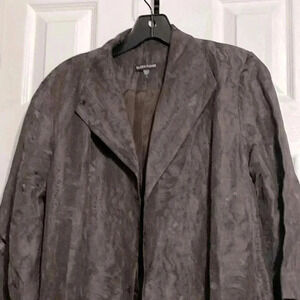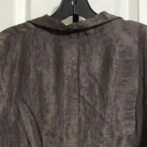 Picture colors a bit off but dark brown with sheen - video shows it best. Cotton ramie polyester silk lined jacket - no closure - pockets. Nice two tone design with a slight sheen. Lightweight. Approximate Measurements Laying flat: pit to pit 22” - shoulder to hem 24” - sleeves 18”. Preowned good used condition please check all pictures.