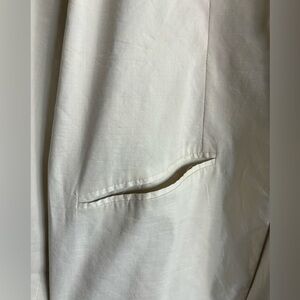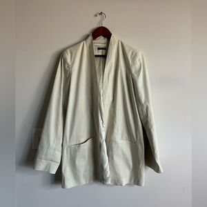 Great conditions Eileen Fisher cream color blazer. No stains, rips or bad odor. Silk, remie, and elastarelle fabric. Great to pair with button up tops. the blazer does not have buttons. Has two large pockets on each side. lightly padded on the shoulders. Great blazer for formal wear, office job, and more. Please see pictures for more details.