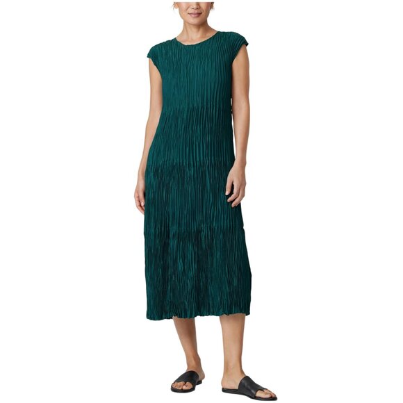 "This Eileen Fisher midi dress is crafted from 100% silk and features hand-pleated crinkled texture with a flouncy tiered skirt, jewel neck, and cap sleeves. It has a back keyhole with button-and-loop closure.