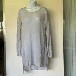 Eileen Fisher tunic in pale gray. Round neck and long sleeve. Split sides and hi low hem. Tencel linen blend. Slub fabric. Lightweight. Semi sheer. Bust 19” length 32” - 36”. Excellent condition. Size M