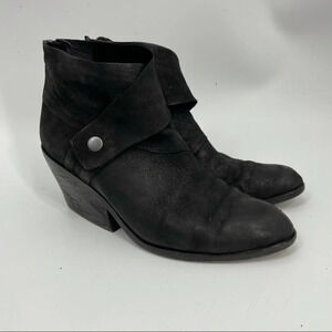 Cute little ankle booties from Eileen Fisher. These have a chunky 2 inch heel that is nearly a wedge. The nubuck leather crosses at the ankle. These are in good preowned condition with some signs of wear but no big flaws. Size 7. Garnet Hill