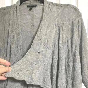 Merino wool lightweight cardigan sweater no closure. Front sides hang lower than back. Has a pretty pattern & not itchy almost feels like cotton. Approximate Measurements Laying flat: pit to pit 20”  - shoulder to hem 24” back to 37” sides - sleeves short. Preowned good used condition please check all pictures.