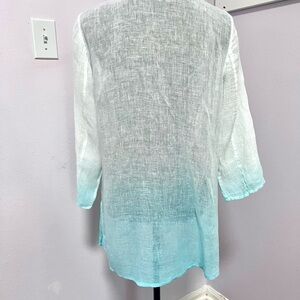 Pre-owned light blue knit top by Eileen Fisher. Ideal for any occasion. Long sleeves, button-down front, and side slit hem and cuffs. Lightweight linen fabric.