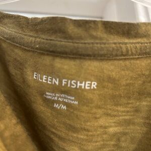 Stylish Eileen Fisher Jersey Square olive, Organic Linen, top with short sleeves. Perfect blend of comfort and elegance.