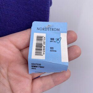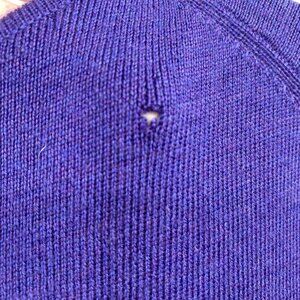 The tag has come unstitched on one side. Small defect around the neckline, and moth hole noted in the back near the collar line.