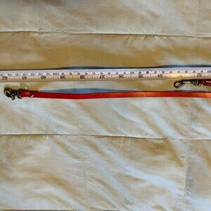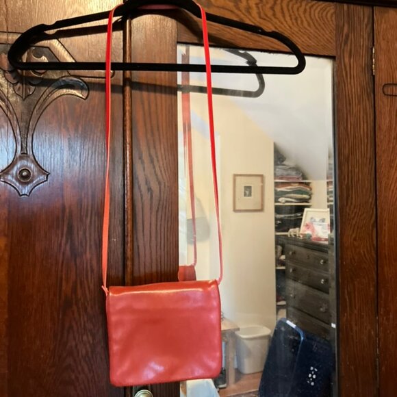 This is a beautiful bag I bought because I'm a sucker for red. The slightly shiny (not patent--just polished from use) leather is the quality you'd expect from Eileen Fisher, and though the size is small, it has enough room for cards, cash, makeup essentials, and a small phone. (The one in the picture is an original SE, the size of the new iPhone Mini, I believe.) The hardware is brass--very tiny dog clips!--and the original strap is rolled. I also bought a slightly longer strap, which doesn't quite match (it's a lighter shade of red, and the underside is natural) but still works. Perfect for throwing in your carry-on for short trips, perfect for grabbing for quick errands, perfect for stadium outings (it meets size requirements as of the time of listing), perfect for just being unburdened.