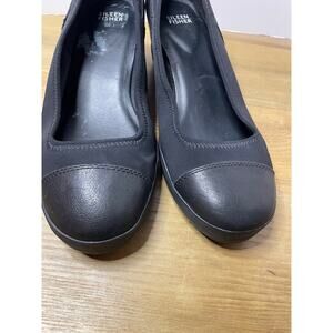In good condition, some minor color missing from the insole of 1 shoes - is not seen when worn and does not effect usability. Super comfy black wedges - leather toe, rest of shoe upper is nylon.