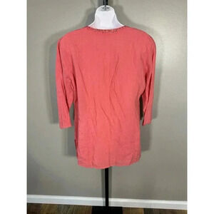 Elevate your casual or travel outfit with this Eileen Fisher popover top. The pink 100% linen fabric is lightweight and breathable, making it perfect for summer, fall, or spring. The relaxed fit and casual sleeve type provide comfort and versatility, while the V-neckline and pullover closure add a touch of elegance.