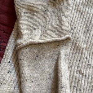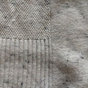 Box cut wool sweater in salt-and-pepper yarns featuring 3 different types of knit stitches and cute trim details