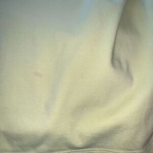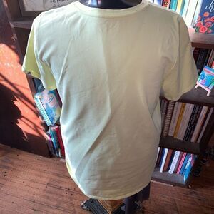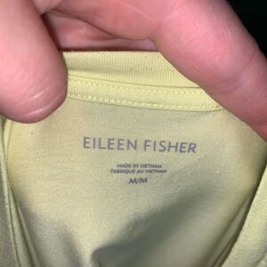 Eileen Fisher pale yellow, stretchy, organic cotton/elastine blend, basic tee. In good, used condition. There are a couple of spots that are discolored, but it’s hard to tell they are they, since they are light. They are there though. Approximately 20 inches from armpit to armpit, 28 inches long. From a pet and smoke free house.