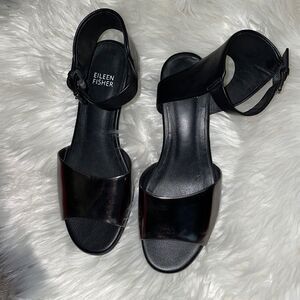 Eileen Fisher Catch Ankle Wrap Sandals 8 Pewter + Black Mirror Leather Shoes, size 6. Like new condition! 1 3/4” stacked heel. Ankle cuff with buckled strap. Leather upper and rubber sole.