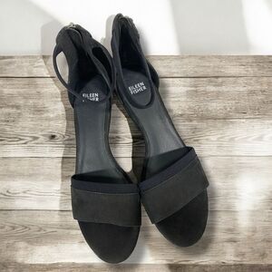 Eileen Fisher "Mirth" suede sandals with mesh trim 2.25 in / 55 mm covered heel Open toe Wide band upper Elastic ankle band Back zip eases dress Leather/Rubber outsole Lining: Leather